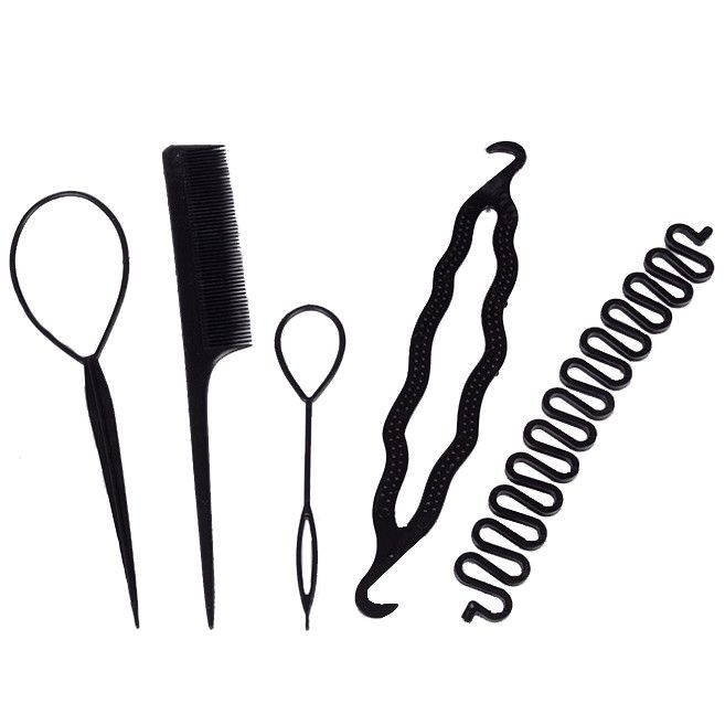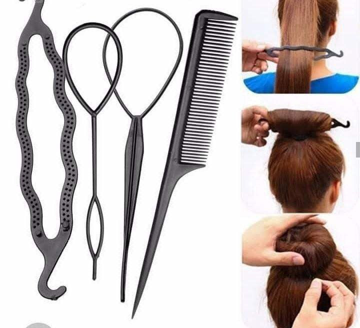 آرایش دهنده مو ساده و کاربردی جنس پلاستیکی به همراه راهنمای آرایش مو چهار تکه همراه با شانه دم باریک بامتل،دو سوزن مو در دو سایز و شابلون بافت مو شانه دم باریک برای تقسم مو