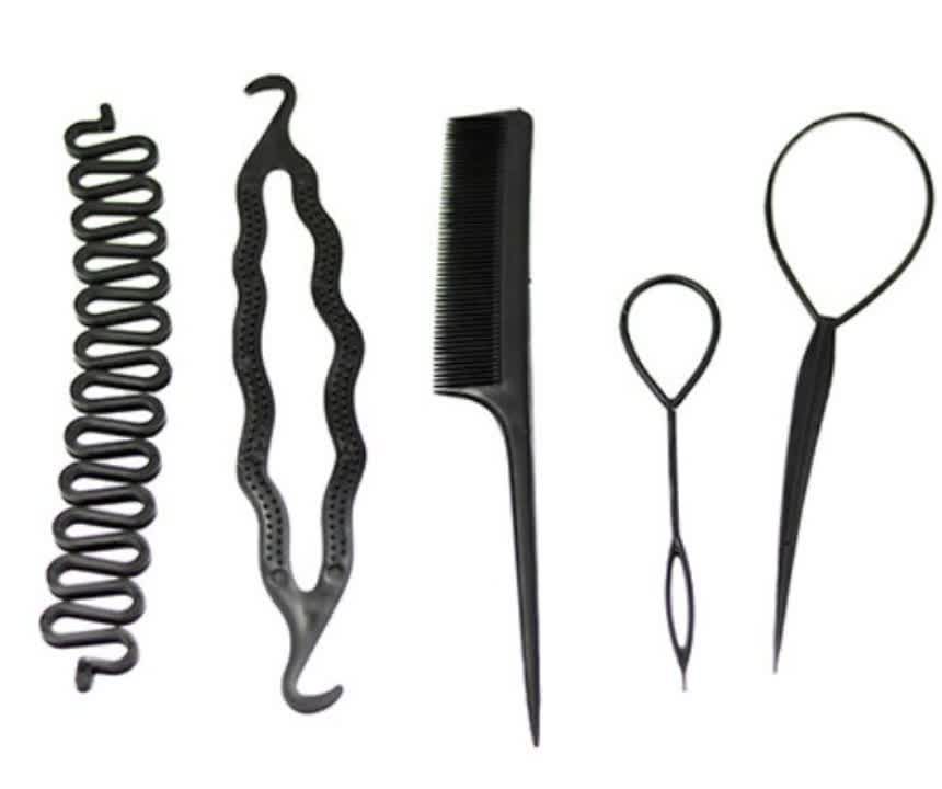 آرایش دهنده مو ساده و کاربردی جنس پلاستیکی به همراه راهنمای آرایش مو چهار تکه همراه با شانه دم باریک بامتل،دو سوزن مو در دو سایز و شابلون بافت مو شانه دم باریک برای تقسم مو